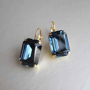 These elegant earrings are made with fancy emerald cut Premium Quality European Crystal and come in gold, rose gold or silver finish.
