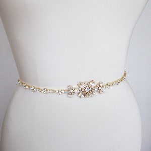 This exquisite vintage inspired belt features Premium Quality European Crystal design in opal and clear crystal mix. The crystal design measures 14 1/2" long and 1 3/4" wide in the center. The satin ribbon measures 3/8" wide and 150" long. Available is gold or silver finish and with a variety of ribbon options.