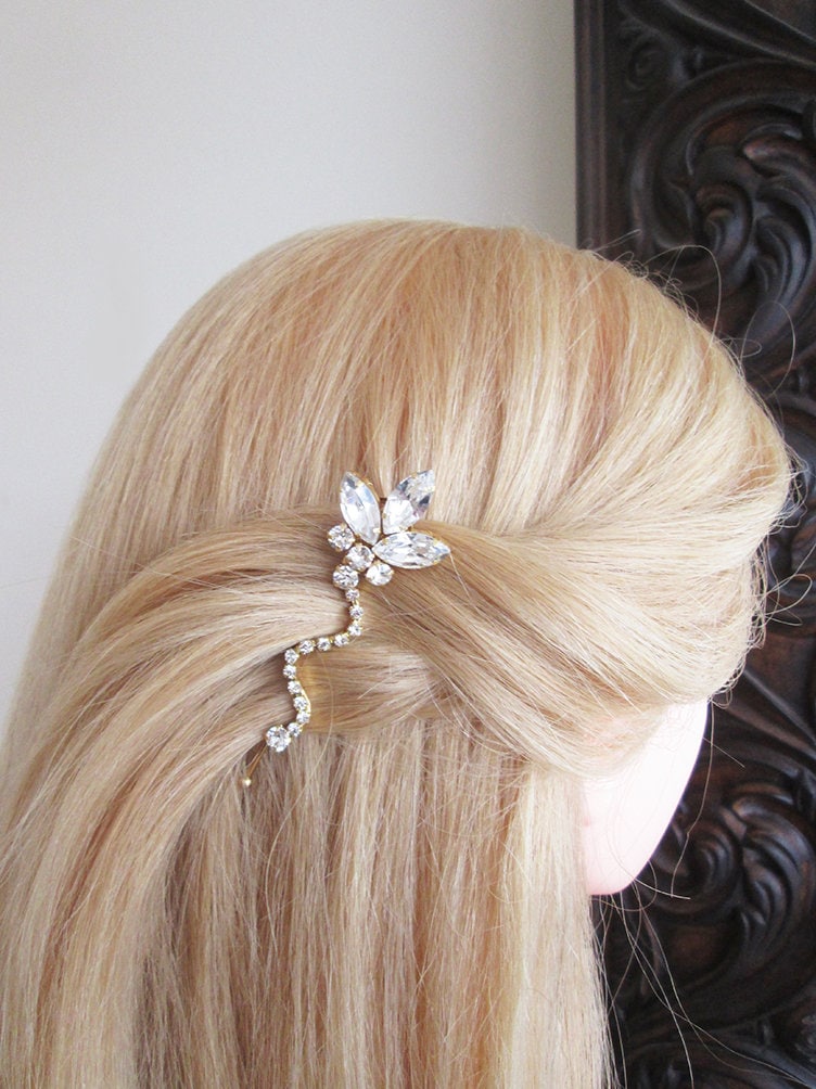 This sparkly crystal bobby pin measures 2 1/2" long and 1" wide at the widest point. Made with the Premium Quality European Crystal. Available in gold, rose gold or silver finish.