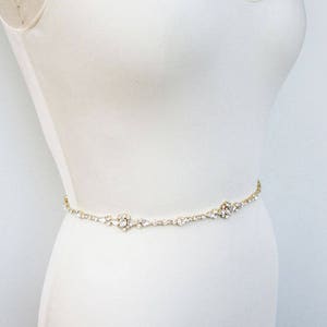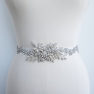 This elegant bridal belt is made with the Premium Quality European Crystal design appliquéd on a 1" wide double face satin ribbon. The crystal design measures 3 1/2" long and 1 5/8" wide in the center. The entire sash measures 150" long. Available in gold, silver or rose gold finish and with a variety of ribbon colors. Shown in the photos with Pink Blush ribbon and in rose gold finish.