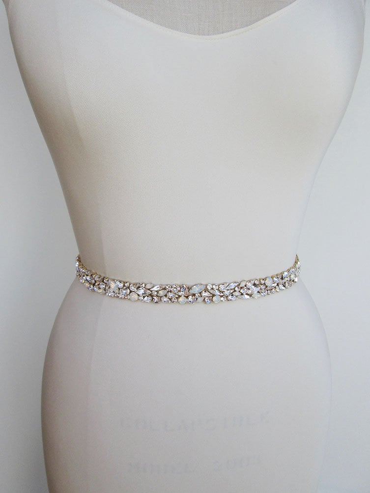 This belt is made with the fine Premium European Crystal in clear and white opal mix set in gold settings. The crystals are appliquéd on a sheer organza ribbon. The beading measures 5/8" wide and 15" long. The entire sash measures 150" long. This belt is available in gold, silver or rose gold finish and with organza or satin ribbon. The belt in the photos shown in gold finish with off white organza ribbon.