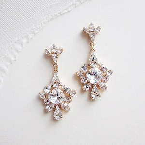 These fun romantic earrings are made with fancy transparent Premium Quality European Crystal in various shapes framed in crown settings. Beautifully delicate and chic. Available in gold, rose gold or silver finish.