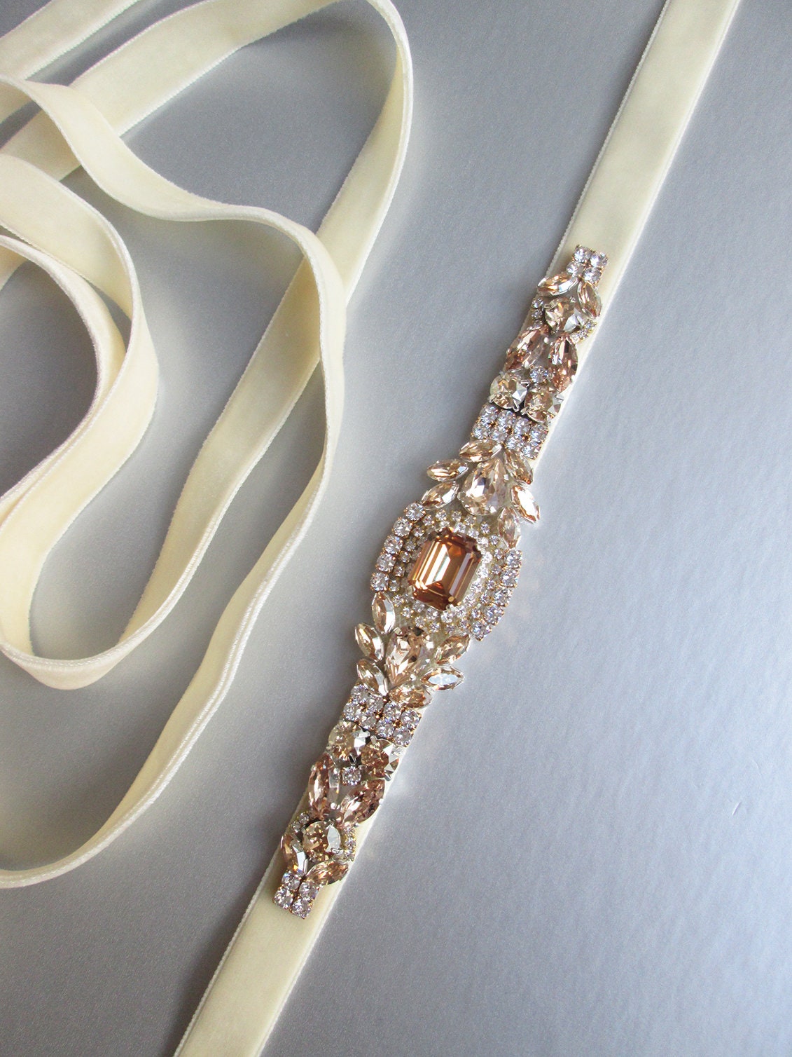 Ivory velvet Crystal bridal belt, Velvet belt, Rhinestone Wedding belt, Waist sash, Premium Quality European Crystal belt in champagne honey