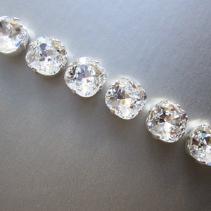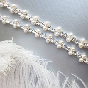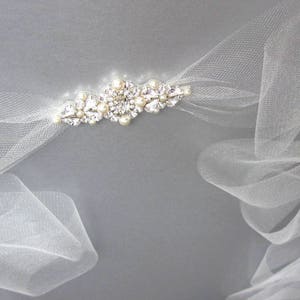 Super sparkly and delicate open work crystal design appliquéd on a pale pink tulle sash. This sash measures 6" wide and 180" long, The crystal part of the belt measures 10 1/4" long and 2" wide in the center. This style can be worn as a headband as well. The tulle ribbon is available in white, ivory, silver, pale pink, dusty pink, champagne and old gold.