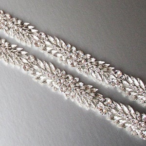 This sparkly skinny bridal belt is made with the Premium Quality European Crystal beaded on 3/8" wide double face satin ribbon. The crystal part of the belt measures 24" long and 3/8" wide. The entire sash measures 150" long. Available in gold, silver and rose gold finish. This belt can be made with organza, satin or grosgrain ribbon. Shown in the photos in gold finish and with off white satin ribbon.