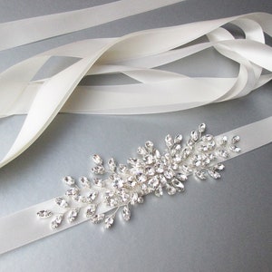 This beautiful unique belt is made with all fancy Premium European Crystal hand set in silver settings and appliquéd on a sheer tulle. The sash measures 1" wide and the length is made to fit. Hook and eye closure in the back. This belt can also be made in gold or rose gold finish at your request.