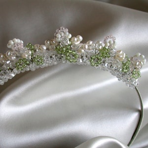 This elegant headband is made with sparkly Premium Quality European Crystal. The headband measures about 3/4" wide and 15" long. It comes with two small combs attached for easy positioning in your hair. Available in gold or silver finish.