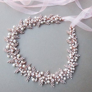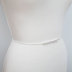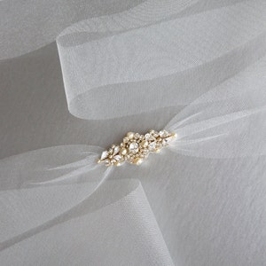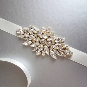 This beautiful romantic floral belt features Premium European Crystal design in opal, ivory cream and clear crystal mix. The crystal design measures 16" long and 1 1/4" wide in the center. The ribbon measures 3/8" wide and 150" long. Available is gold, silver or rose gold finish. This belt is available with a variety of ribbon options. Shown in the photos with the dark ivory double face satin ribbon and in gold finish.