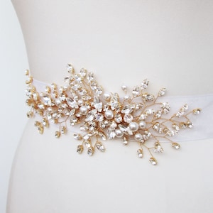 This weightless sash also looks beautiful worn as a head band or a bracelet. The vintage Chantilly lace used is an ivory color and it is appliquéd with a sheer silver organza, giving it a magical shimmer. The sash is accented with clear crystals and attached to a sheer silver organza ribbon. The applique design measures about 7 1/2" long. The organza ribbon sash measures 140" long and 1 1/2" wide. This style is also available with ivory organza.